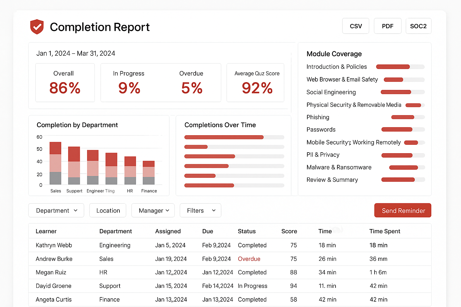 Audit-ready proof: Completion records, quiz scores, and policy sign-offs for customers and regulators.